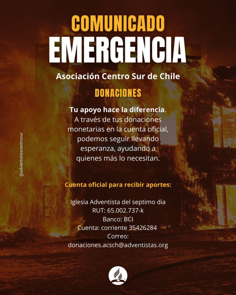 De acuerdo con Noticias.adventistas.org la iglesia adventista de Chile ha hecho un llamado a todos sus miembros a permanecer unidos en oración, pidiendo por el control de esta emergencia, por consuelo para las personas afectadas y por protección para bomberos, brigadistas y voluntarios de diversas instituciones que trabajan incansablemente en el combate de los incendios y la atención de los damnificados.